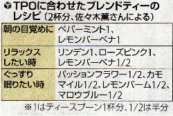 飲み続けることで効果が表れてくるハーブティだが、独特の味になじめない人もいる。ハーブ同士をブレンドしたり、他の飲み物などと合わせたりすると、ぐっと飲みやすくなる。ハーブコーディネーターの佐々木薫さんにコツを教えてもらった。 まず、香りや味が似たハーブをブレンドしてみよう。甘い香りのカモマイル(カモミール)とラベンダー、さっぱりした味のペパーミントとローズマリー、酸味のあるハイビスカスとローズヒップ・・・・・といったブレンドで味がまろやかになり、同じタイプでも微妙な違いが出る。次に、好きなタイプをベースに別のタイプのハーブを合わせてみる。甘みが欲しい時はオレンジピール、清涼感を出すにはレモングラスといった具合だ。最初から多くの種類を混ぜると、味や香りがわからなくなるので3〜4種類を目安に。「ブレンドすることで深い味わいになり、ハーブがもつ効能の相乗効果も期待できます」と佐々木さん。ハーブの特徴を生かし、TPO(時、場所 、場合)に合わせてブレンド=レシピ参照=するのも楽しい。他の飲み物とのブレンドでは紅茶が初心者にお薦め。セイロンティーはくせがなく、ハーブの香りが生かせる。アールグレイは柑橘系ハーブのレモングラスやレモンバームと相性がいい。 フルーツジュースの場合はアイスハーブティーを通常より少し濃いめに作り、ブレンドする。洋酒とのブレンドもハーブの薬効を引き出すという。カモマイルやラベンダーはウオッカやジン、ウイスキー、ブランデーに合う。 佐々木さんは「ハーブの割合の微妙な違いで様々な味や香り、色に変化が出るのもブレンドの魅力です。色々と試してみて自分好みの味を見つけてほしい」と話す。 |