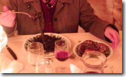 ワインを飲みながら真っ黒なイカ墨のスパゲッテイを食べました。 そうそうパンも美味しかったな〜。ところがたべ終わったころウェイターが「メインディッシュの肉や魚はナンにしますか?」と聞きにきましたが 、止めにしました。日本人は経済的ですね〜。 |