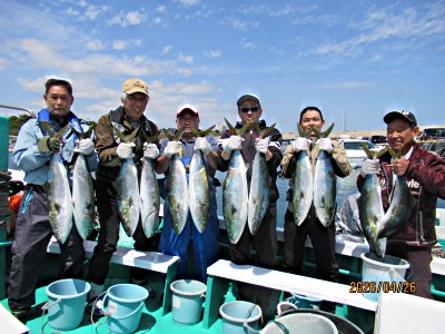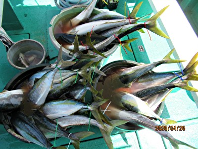 ワラサ3.5〜6.8キロ3〜7本/人合わせて26本、サンパク5本、マダイ0.4、0.5の2枚、ハナダイ2枚、カサゴ2匹、ホウボウ2匹、カナガシラ1匹でした。