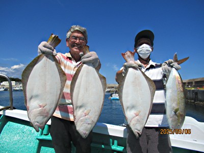 [JPEG画像]: F様とT様、今日もヒラメ2.0キロでの写真となりました。 -(38 KB)