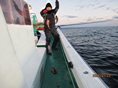 ヒラメ食い渋く不調でした。本日の釣果ヒラメ0.7〜2.8キロ1〜2枚/人合わせて4枚、マトウダイ1枚、良型カサゴ2匹、Kソイ1匹でした。 今朝も厳しい冷え込みで指先が痛くなりました。朝から晴れ北西〜西の風4〜6m後半8m程度風波高で当たりも取りづらい海況でした。 イワシの反応は一部では有りましたがほんのチョロ程度でした。やや強風で寒い中また波高の中頑張って頂きましたが当たりもイマイチで苦戦、それでも粘って頂きヒラメ1〜2枚、外道も少々ゲットして頂きました。 指先も痛くなる厳しい中頑張って頂きました。お疲れさまでした。有難うございました。