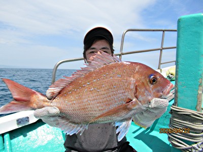 青物、マダイ共に不調でした。本日の釣果サンパク4〜5本/人合わせて9本、マダイ0.5、1.7キロの2枚、ハナダイ0.5キロ2枚、良型マハタ1匹、カサゴ2匹、ホウボウ1匹でした。 朝から晴れ薄日、北西〜南西の風4〜5m程度、やや風波高でした。水深25〜40〜55m付近表層水温15.6〜16.3〜16.5度でした。 朝一青物狙いでしたが反応無し、実績のポイント付近の流し釣りではぐれサンパクが時折ヒットする程度でした。 後半はマダイ狙いに変更でしたが当たりも遠く苦戦、マダイ、ハナダイがチョロ、外道もチョロ程度でお土産少々でした。 お疲れさまでした。有難うございました。