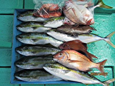 マダイ形無し不調でした。本日の釣果手のひらハナダイ2枚、良型カサゴ4匹、イナダ1本、マゾイ、ホウボウ、大サバ、大アジでした。 朝は曇りのち晴れ北からの風3〜4m程度と弱くでしたがややウネリ大でした。水深35〜40m付近表層水温15.5〜16.2度でした。 昨日からのウネリの影響で底荒れが治っていないのか?また底潮が下がったのか?当たりも遠く食い渋りで苦戦でした。 後半は35m付近探りましたがやはり当たりも遠く苦戦でした。食い渋い中頑張って頂きましたがお土産ゲットならずでした。 お疲れさまでした。有難うございました。