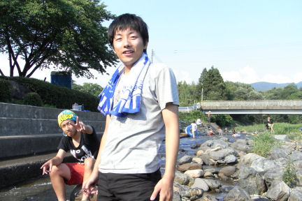 道沿いに良い川を見つけ、足を浸けて涼んだ。橋のたもとでは子供達が飛び込んで川遊びを楽しんでいた。そこには、古き良き日本の姿があった。かつて会瀬の磯場で飛び込み楽しんでいた自分達をふと思い出したりもした。