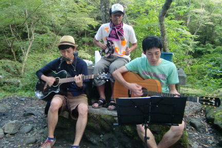 焼いて、食べて、川で遊んで、疲れたらまた焼いて…。BBQが一段落した頃、今年も3人の野外ライブが始まった。「春一番(ゆず)」「飲みに来ないか(スキマスイッチ)」「太陽(コブクロ)」「Simple(Mr.Children)」「友達の唄(ゆず)」緊張の中、何とか5曲歌いきった。さて、いかがだったでしょうか!?