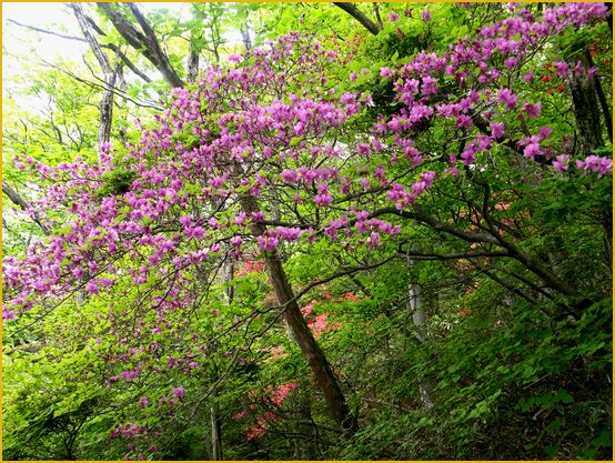 1350mあたりからが五葉ツツジの群落である。 と云っても樹齢300年を超す大きな樹なので下から見上げる形であり、 花が無ければツツジとは解らないだろう。 見事なものだ。