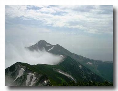 ”左から、双六岳、三俣蓮華岳、鷲羽岳。遠方に薬師岳”