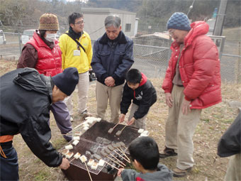 | 新年になり初めての活動日は、少年団も一緒に小正月の風習として伝わっている 伝統行事の「繭玉まつり」でした。 五色の餅を「家内安全」「五穀豊穣」を願ってミズノ木の枝にさして、 見事な繭玉飾りの完成です。 また、古いお札やお正月飾りを焼く「どんど焼き」も行いました。 昼食は、お餅やこんにゃく、お豆腐を田楽にしていただきました。 |