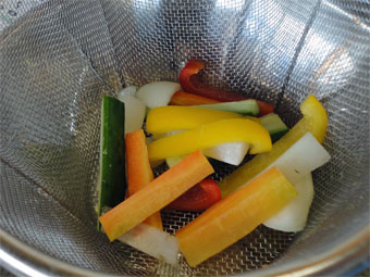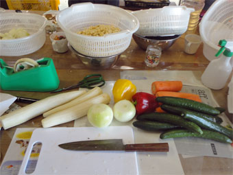 | 今日はピザハウスに移動し、初の「ピクルス」作りに挑戦しました。 きゅうり、にんじん、たまねぎ、パプリカ、大根などの野菜をスティック状に切ります。 それを湯通し後熱湯消毒した瓶に詰め、香辛料も入れて 前もって作って置いたピクルス液を注ぎ入れ蓋で密封します。 それぞれが我が家に持ち帰り出来上がりが楽しみですね。 午後は、新しく葺き替えたテラスの雨水がスムーズに流れるように 竹で「とい」を作り埋めました。 また、畑の大根、白菜、カブ、小松菜も収穫しお土産に。 |