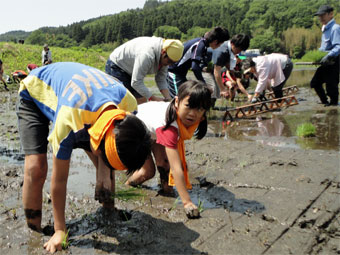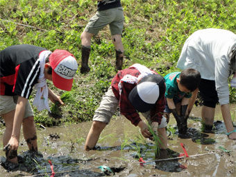 ![]() 田植え体験のゲストの皆さん頑張ってます |