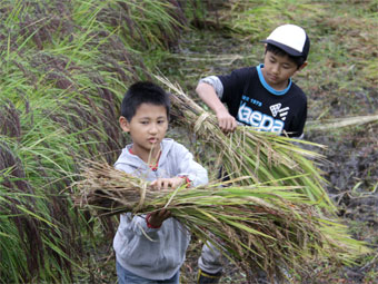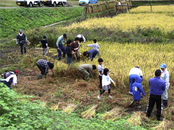 賑やかに稲刈りをしました。どんどんはかどりました。