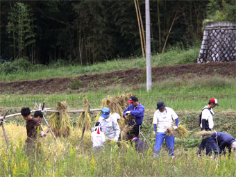 刈った稲はおだ掛けして干します