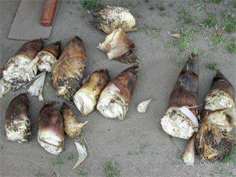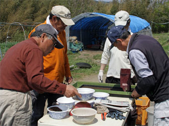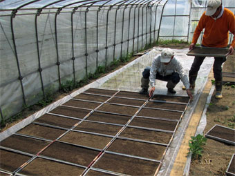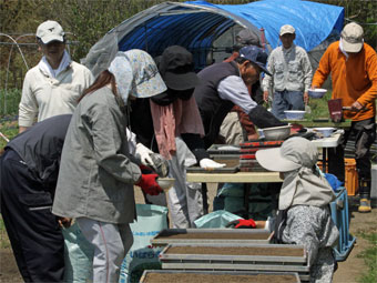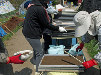 | 野山の木々もぐんぐんと新芽を伸ばしきれいな萌木色となってきました。 いよいよ田植えに向けて「種まき」の作業をしました。 箱に平らに土を入れ、芽出した種籾を丁寧にまきその上にまた 土をかけハウスへと移動し立派な「苗」になるのを待ちます。 昼食後は、タケノコ堀りや山菜採りもしてお土産に持ち帰りました。 |