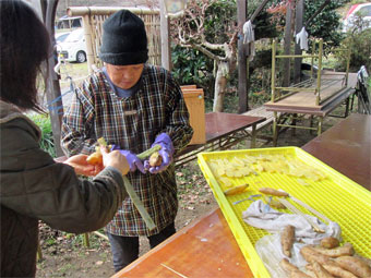 さつまいもの「いずみ」は、蒸かし竹べらで皮をむいて