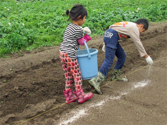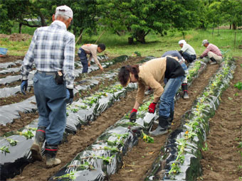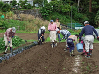 「紅あずま」「紅はるか」などのサツマイモ苗500本近くを植えました。