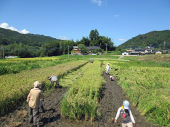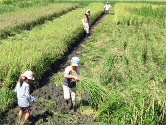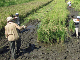 田んぼは、ぬかるみで大変苦労しましたが「稲刈り」をしました。
