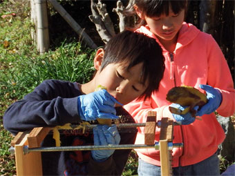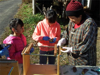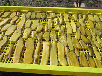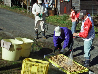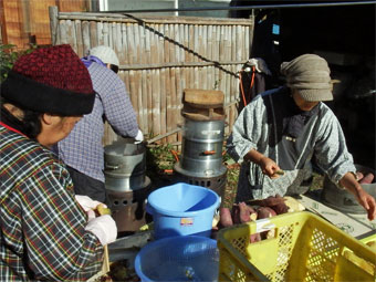 本部前では、乾燥芋用のさつまを蒸かして熱々のうちに皮を剥き