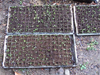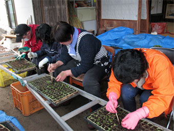軒下でミックスレタスの小さな苗を一本一本そっと丁寧に