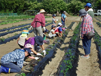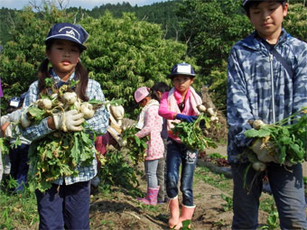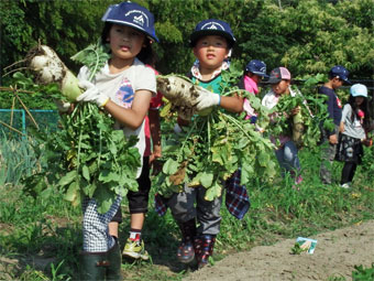 収穫時期を迎えたレタス、大根などたくさんの野菜を採ったり