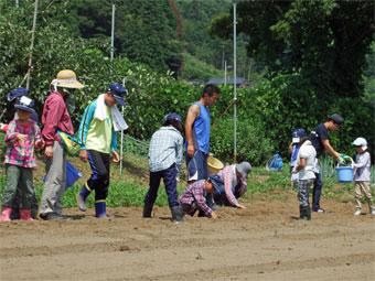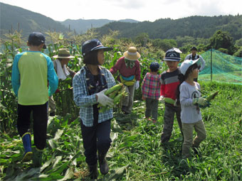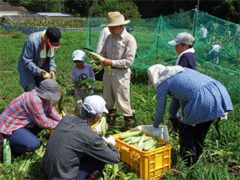 今日は、少年団員も一緒に畑に出て、トウモロコシの収穫、