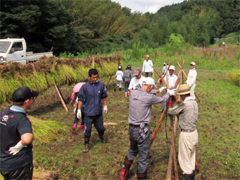 田んぼに出て実った稲を刈り、束ねておだがけに干す作業です。