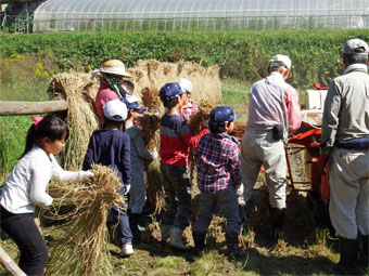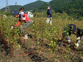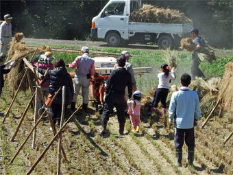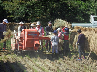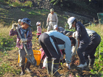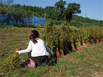 | 秋の長雨もやっと止み晴天続きとなっております。 今日は、少年団員も一緒に「そば刈り」をしました。 のこぎり鎌でそばの実を落とさぬように刈って束ね立て掛けて 一列に干しました。良い天気だったので「脱穀」の作業も進めました。 午後はさつま芋掘りでした。 |