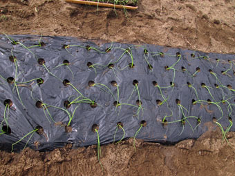 マルチを敷き見事に育った苗を一本づつ丁寧に植えていきました。