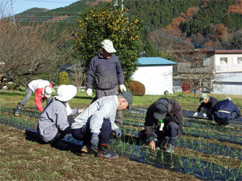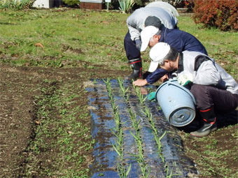先月植えた玉ねぎ、ニンニクの草取りと追肥作業です。