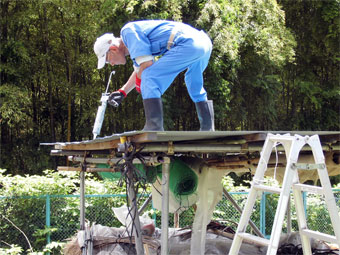 また資材置き場の屋根も器用に修理完了です。