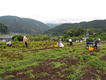 ジャガイモ掘り、なすの支柱立て、野菜畑の除草、キャベツの収穫、