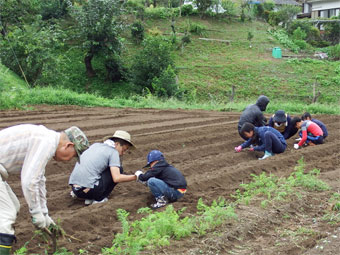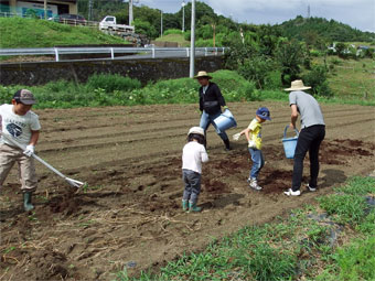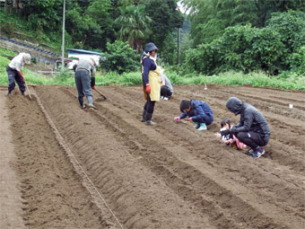 少年団員も一緒に長大根、丸大根、大かぶ、水菜、春菊の種蒔きと
