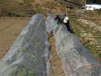 野菜に掛けておいたネットが強風で剥がされたので直したり、