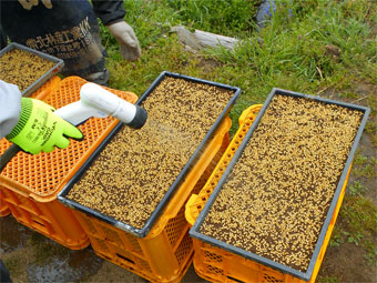 きょうはコシヒカリの種蒔きをしました。蒔いた箱をハウスの中へと移動し