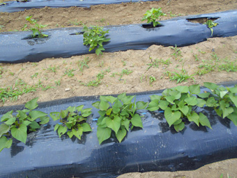 高畝を作りそこに穴あきマルチを敷きそこへ一本一本丁寧にサツマイモの苗を