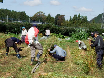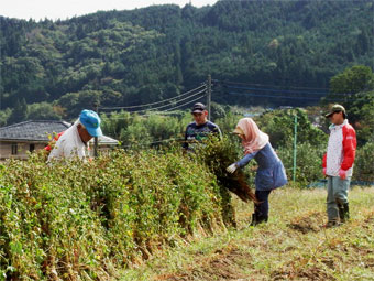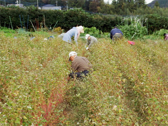 そば畑に行き刈って、束ねて、立て掛ける仕事をしました。