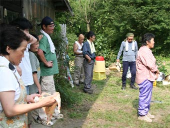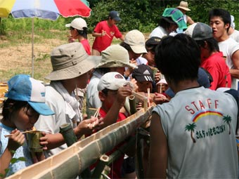 ![]() 流れてきたよ。トマトもとうもろこしも。 野外の味はうまいよ。(流しそうめん) |