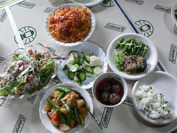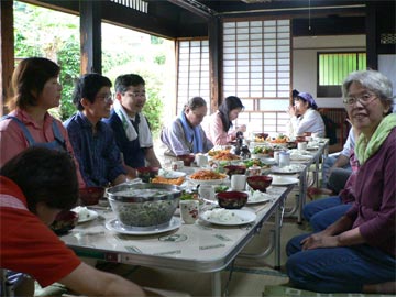 ![]() いつもながらの楽しい食事 一番手前が茹でたてそら豆 |