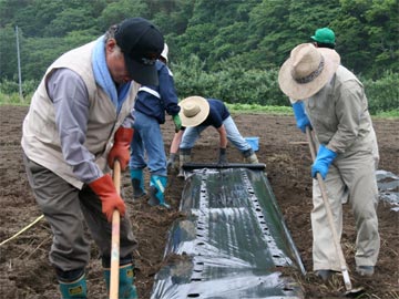 畑へ出てうねきり、堆肥入れ、マルチかけ