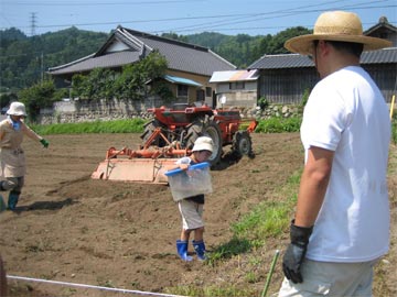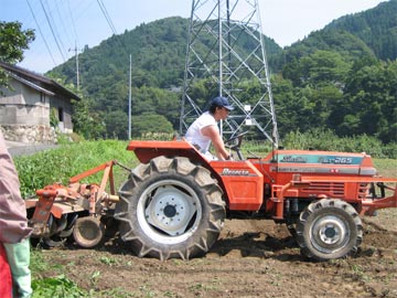 大型のトラクタ-で畑を耕し、畝を切り、肥料を入れ、種を蒔き、土をかける作業です。