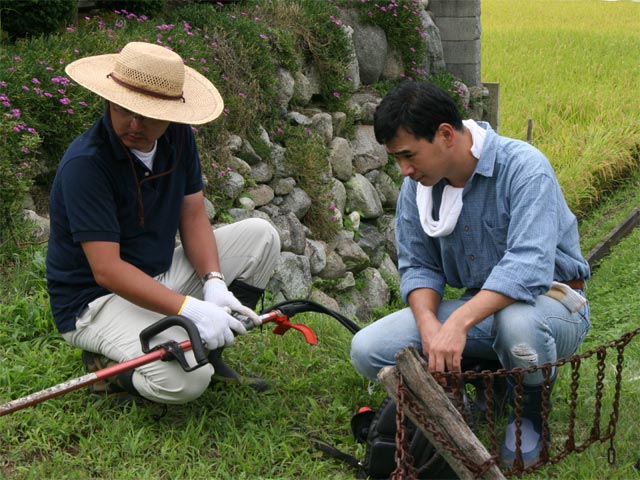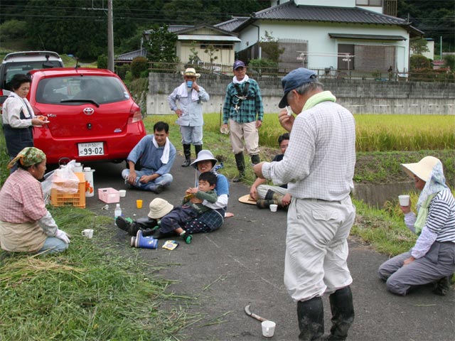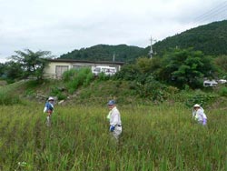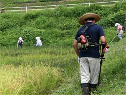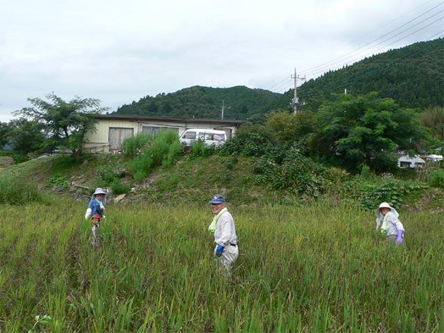 秋の気配が漂うなか、稲刈りにむけて田んぼの寄せ刈り、