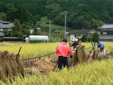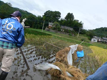 午後、男の人たちは田んぼに残っている稲刈りを、