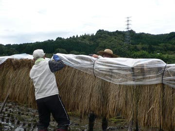 雨に濡れた稲穂はぐっしょりと重たくて皆で苦労して手直しを終えました。