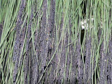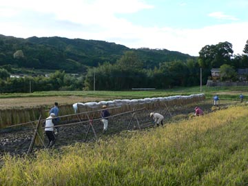 女の人たちは午前中に刈った古代米の稲穂の選別をして結わえ天井に吊るす作業です。
