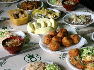 ![]() メニューは卵入りコロッケ、味ご飯、しいたけ |