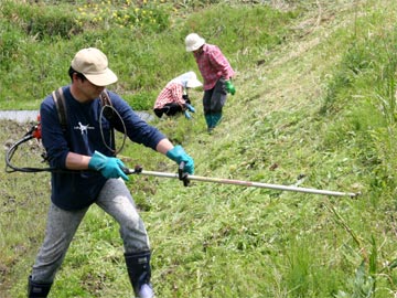 午前中かかって田の周囲の草刈り、肥料まきをしました。