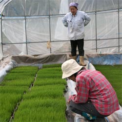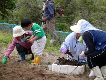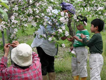 午後は畑で草取り、ヤーコンの植え付けでした。その後、リンゴの摘花の実習。