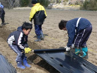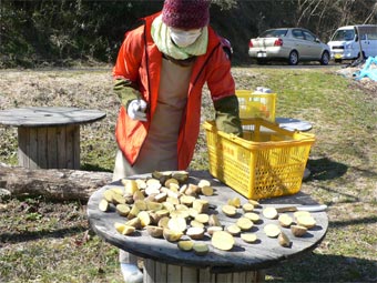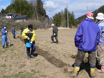 | 春の訪れがちょっと足踏み状態となったきょうは、年度末最後の活動日となりました。 縁側に腰掛けて皆そろったところで「朝茶」を飲みながらいつもの和気あいあい談笑。 さあ!じゃがいも植えに行くぞ! と一斉に西上渕農場へと出掛けました。 種じゃがいもから出ている「芽」を上手に生かして半分位に切り 少し天日に干し乾かしました。 畑作りは肥料を入れマルチを張る土台を形作りその上に黒いマルチを掛け 男爵、トヨシロ、北あかり等の種芋を深く植えました。 昼食を挟んでしいたけの菌入れまた玉ねぎ、紫玉ねぎの苗も植え 今日一日の作業を終えました。 皆さん!お疲れさまでした。 来年度もまたひき続きよろしくお願い致します。 |