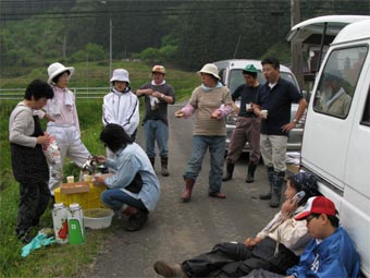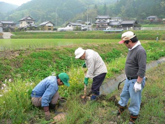 | ゴ−ルデンウィークも最終日となった今日の活動日の作業は 2週間後に迫った「田植え」の準備です。 伸びた寄せの草を刈り、水を引く用水堀の掃除をしたり、 あぜなみを入れたりの仕事を分担して進めました。 途中から雨が本降りになってしまいましたが 皆さんのご協力で予定の作業を終えることができました。 雨の中の作業大変お疲れ様でした。 濡れて風邪などひきませんようにくれぐれも気を付けてください。 昼ごはんを挟んで雨の中のたけのこ堀りにも挑戦し 掘ったたけのこをお土産に戴いて帰路に着きました。 |