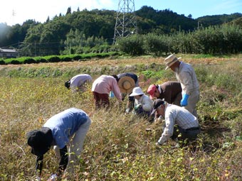 ![]() そばと雑草をよりわけながら刈り取り |