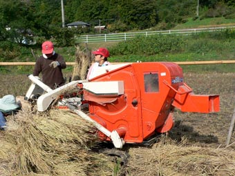 ![]() 脱穀は機械力で |
